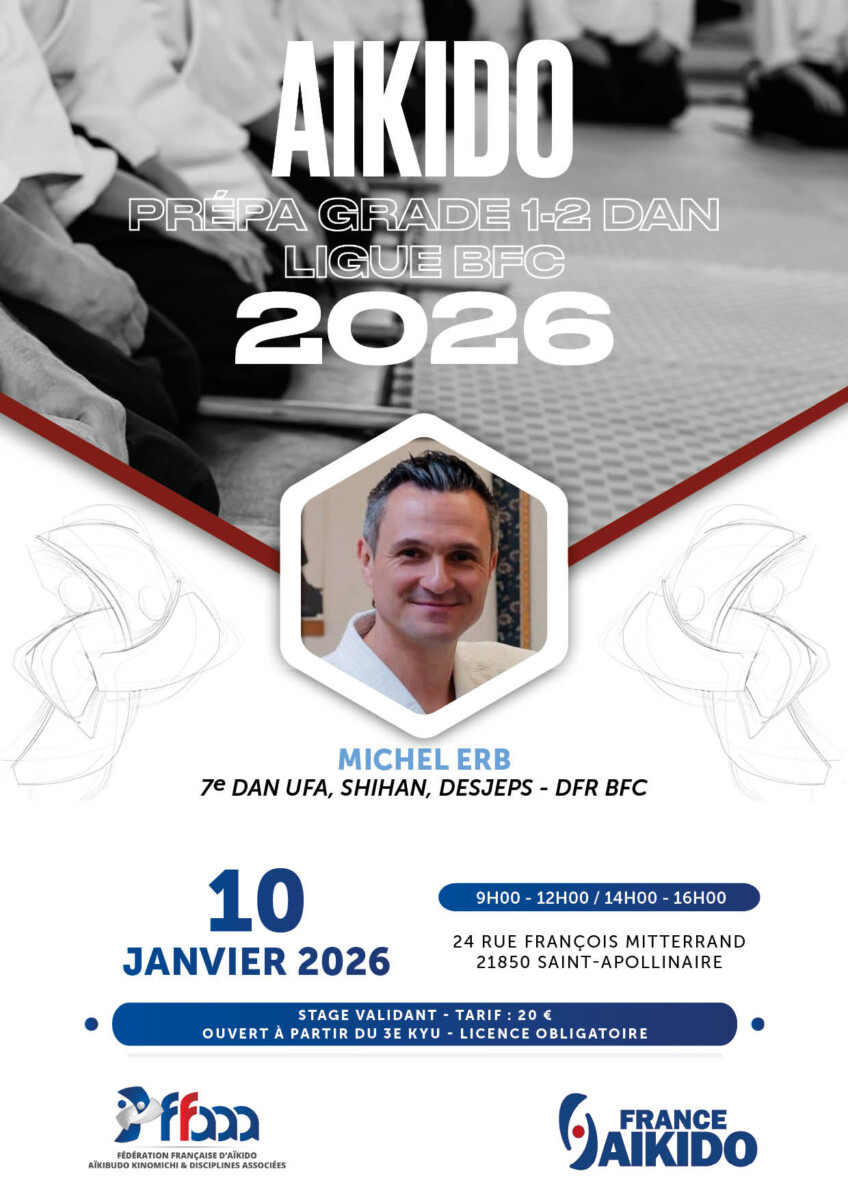 Current Monthjanuary 2026Stage préparation aux passages de grades dan ligue BFC a st-apollinaire (France) 10jan09:0016:00Stage préparation aux passages de grades dan ligue BFC a st-apollinaire (France) Event Details Event Details Time(Saturday) 09:00 - 16:00 CalendarGoogleCal stage a Altkirch (France) 11jan09:0012:00stage a Altkirch (France) Event Details Event Details Time(Sunday) 09:00 - 12:00 CalendarGoogleCal Stage d’Aikido A Troyes (France) 17jan14:0017:00Stage d’Aikido A Troyes (France) Event Details Event Details Time(Saturday) 14:00 - 17:00 CalendarGoogleCal stage de ken-jutsu a Liestal (suisse) 18jan10:0018:00stage de ken-jutsu a Liestal (suisse) Event Details Event Details Time(Sunday) 10:00 - 18:00 CalendarGoogleCal Stage d’aikido a Marcq en baroeul (France) 24jan13:0018:00Stage d’aikido a Marcq en baroeul (France) Event Details Event Details Time(Saturday) 13:00 - 18:00 CalendarGoogleCal stage de ligue et ecole des cadres BFC a Vesoul (france) 25jan09:0018:00stage de ligue et ecole des cadres BFC a Vesoul (france) Event Details Event Details Time(Sunday) 09:00 - 18:00 CalendarGoogleCal february 2026stage d'aikido a Yverdon (suisse) 01feb10:0017:00stage d'aikido a Yverdon (suisse) Event Details Event Details Time(Sunday) 10:00 - 17:00 CalendarGoogleCal stage d'aikido a Melun (France) 07feb10:0013:00stage d'aikido a Melun (France) Time(Saturday) 10:00 - 13:00 CalendarGoogleCal stage d'aikido a joigny (France) 08feb09:0012:00stage d'aikido a joigny (France) Event Details Event Details Time(Sunday) 09:00 - 12:00 CalendarGoogleCal STAGE d'aikido A ATHENS (GRECE) 14feb(feb 14)11:0015(feb 15)15:00STAGE d'aikido A ATHENS (GRECE) Time14 (Saturday) 11:00 - 15 (Sunday) 15:00 CalendarGoogleCal stage d'aikido a leysin (suisse) 28feb10:0016:00stage d'aikido a leysin (suisse) Event Details Event Details Time(Saturday) 10:00 - 16:00 CalendarGoogleCal march 2026stage de ligue et ecole des cadres BFC a Sombernon (france) 01mar09:0018:00stage de ligue et ecole des cadres BFC a Sombernon (france) Event Details Event Details Time(Sunday) 09:00 - 18:00 CalendarGoogleCal stage d'aikido a Florange (France) 07mar14:0017:00stage d'aikido a Florange (France) Event Details Event Details Time(Saturday) 14:00 - 17:00 CalendarGoogleCal stage d'aikido a Attalens (suisse) 14mar10:0018:00stage d'aikido a Attalens (suisse) Event Details Event Details Time(Saturday) 10:00 - 18:00 CalendarGoogleCal stage d'aikido a vesoul (France) 15mar09:0012:00stage d'aikido a vesoul (France) Event Details Event Details Time(Sunday) 09:00 - 12:00 CalendarGoogleCal Stage d'Aikido a Bern (suisse) 21mar10:3017:00Stage d'Aikido a Bern (suisse) Event Details Event Details Time(Saturday) 10:30 - 17:00 CalendarGoogleCal STAGE D'AIKIDO a Cranves Sales (France) 22mar09:0012:00STAGE D'AIKIDO a Cranves Sales (France) Time(Sunday) 09:00 - 12:00 CalendarGoogleCal april 2026stage d'aikido a Mragowo (Pologne) 11apr(apr 11)09:0012(apr 12)17:00stage d'aikido a Mragowo (Pologne) Time11 (Saturday) 09:00 - 12 (Sunday) 17:00 CalendarGoogleCal stage d'aikido a Valdoie (France) 19apr09:0012:00stage d'aikido a Valdoie (France) Event Details Event Details Time(Sunday) 09:00 - 12:00 CalendarGoogleCal may 2026stage d'aikido a Attalens (suisse) 16may10:0018:00stage d'aikido a Attalens (suisse) Event Details Event Details Time(Saturday) 10:00 - 18:00 CalendarGoogleCal Stage a Saignelegier (Suisse) 30may(may 30)10:0031(may 31)16:00Stage a Saignelegier (Suisse) Event Details Event Details Time30 (Saturday) 10:00 - 31 (Sunday) 16:00 CalendarGoogleCal july 2026stage d'ete a vesoul (France) 04jul09:0016:00stage d'ete a vesoul (France) Event Details Event Details Time(Saturday) 09:00 - 16:00 CalendarGoogleCal august 2026stage d'ete d'aikido a leysin (suisse) 06aug(aug 6)10:0009(aug 9)18:00stage d'ete d'aikido a leysin (suisse) Time6 (Thursday) 10:00 - 9 (Sunday) 18:00 CalendarGoogleCal september 2026stage d'aikido a Attalens (suisse) 05sep10:0018:00stage d'aikido a Attalens (suisse) Event Details Event Details Time(Saturday) 10:00 - 18:00 CalendarGoogleCal stage d'aikido a halle (Allemagne) 12sep(sep 12)09:0013(sep 13)17:00stage d'aikido a halle (Allemagne) Time12 (Saturday) 09:00 - 13 (Sunday) 17:00 CalendarGoogleCal